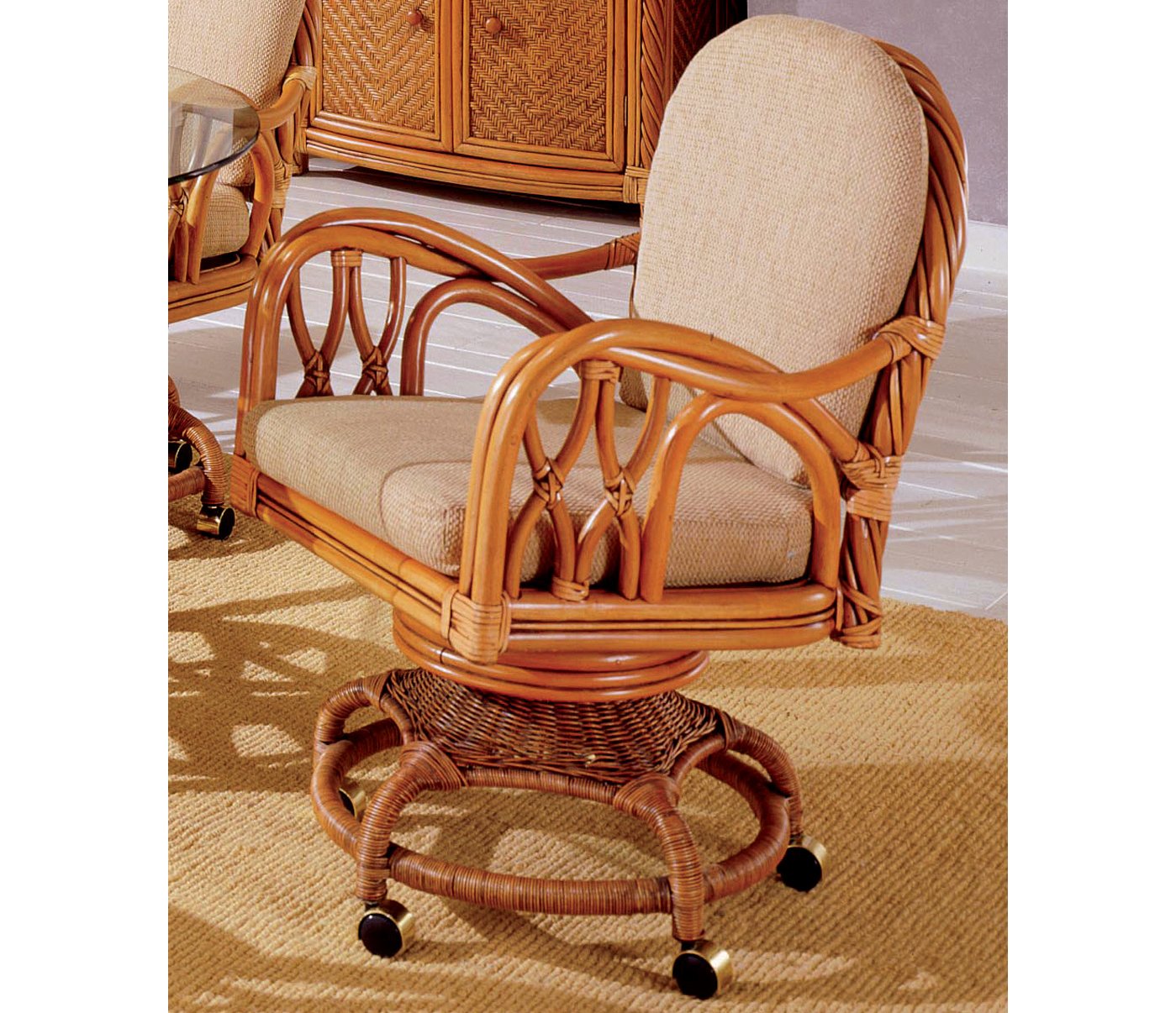 Designed for comfort and convenience, each dining chair includes smooth-rolling casters for easy mobility and comes with plush, customizable cushions available in a wide variety of fabrics to match your décor. The entire set is finished in a rich, antique finish, giving it a warm, classic appeal.